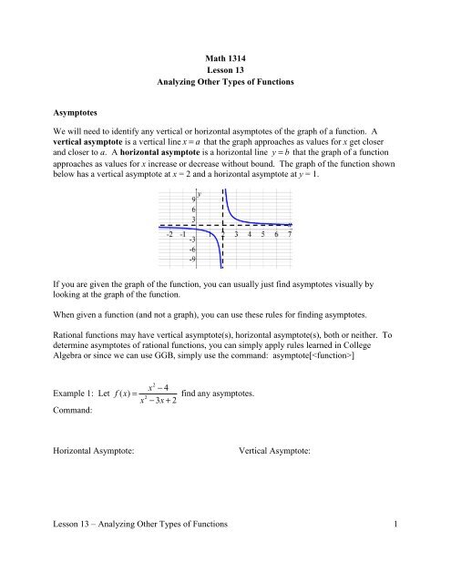 Vertical asymptote (geogebra interactive) horizontal asymptote (geogebra interactive) examples finding limits for piecewise defined functions (khan academy video) introduction to limits (geogebra interactive) introduction to average rate of change (khan academy video) introduction to calculus seeing the big picture (eddie woo video) Differentiation rules general and logarithmic differentiation rules 1. Y = l is the horizontal asymptote of the graph of ƒ. Solution before using theorem 11, let's use the technique of evaluating limits at infinity of rational functions that led to that theorem. There are three kinds of asymptotes: A rational function has at most one horizontal asymptote or oblique (slant) asymptote, and possibly many vertical asymptotes. An asymptote of a curve is a line, such that the distance between the curve and the line approaches zero as they tend to infinity. Nov 10, 2020 · confirm analytically that \(y=1\) is the horizontal asymptote of \( f(x) = \frac{x^2}{x^2+4}\), as approximated in example 29.