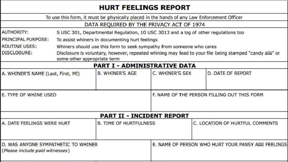 +Alex Cruz here is the butt hurt report form you have been ... from lh3.googleusercontent.com Date feelings were hurt b. Part i administrative data a. Click the link below to download and print the hurt feelings report form. It is also advisable for ones being hurt not to lose temper and get angry, anger actually deepens the situation. The official boyfriend application form. Posts encouraging the harassment of any individual, group, community, or subreddit will be removed, and the submitting user may be banned. No identifying information, including anything hosted on platforms making that information public. When did the military community become such big babies?